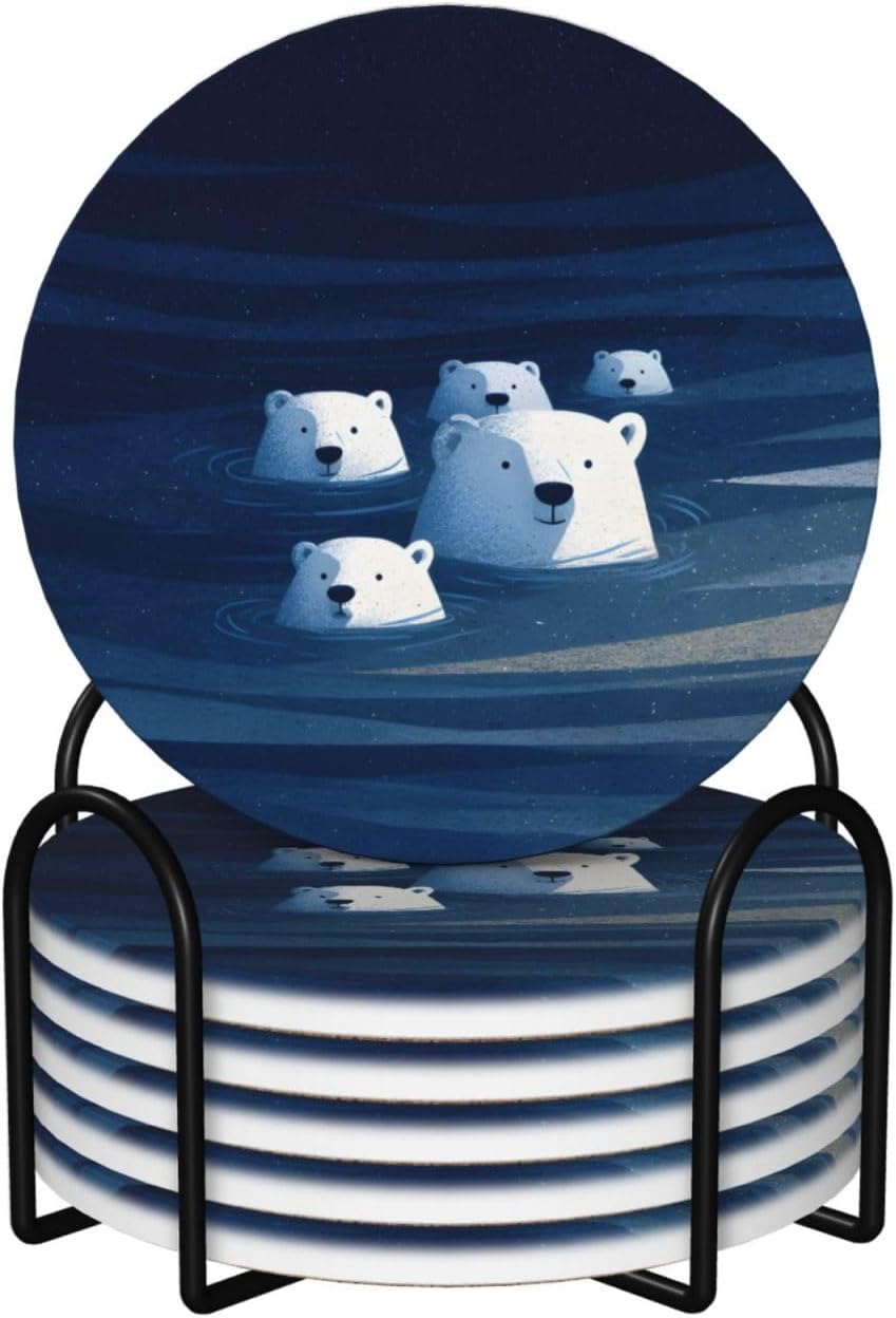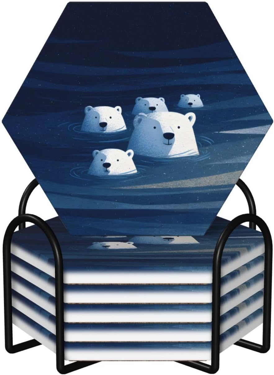 Product Name: DCEHGEW Ceramic Drink CoastersMaterial Type: Ceramic with cork bottomSize: Round: 4.1 x 4.1 inches, Square: 3.9 x 3.9 inches, Hexagon: 4.3 x 3.7 inchesPattern: polar bears About Our Ceramic Absorbent Coasters:Product Features - Crafted from high-quality ceramic, these coasters are odorless and eco-friendly. Their superior absorbency keeps your surfaces dry by quickly soaking up spills from coffee, cola, and other beverages within 10-15 seconds.Applicable Scenarios - Perfect for adding a stylish touch to your kitchen, living room, bar, hotel, or restaurant. These coasters are an ideal present for birthdays, Mother's Day, Father's Day, Valentine's Day, anniversaries, housewarming celebrations, or Christmas.Accessory Structure - Each set includes 6 ceramic coasters with cork bottoms, accompanied by a sleek black metal stand for organized and aesthetic storage. Choose from three different shapes to suit your style and needs.Washing Instructions - Easily clean these coasters with water or a damp cloth.Special NoteDue to different measurement methods, a deviation of up to 0.3 cm in size is considered normal.Please Note:The product images are for reference only. Actual products may vary slightly due to production factors such as batch differences and machine settings. Minor variations in color, position, and size are normal and not considered defects. Thank you for your understanding!Customer Service:We want to make sure you have an amazing experience with us. Please contact us with any feedback you may have. We love to hear from you and usually respond within 12-24 hours.