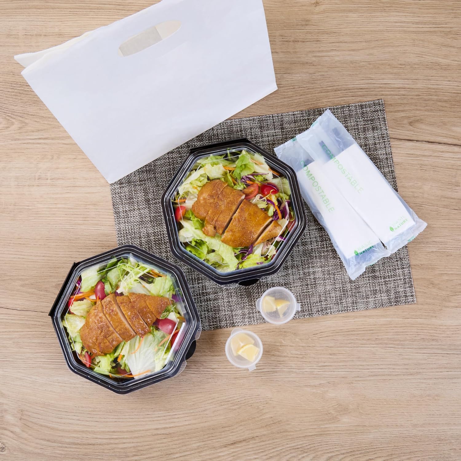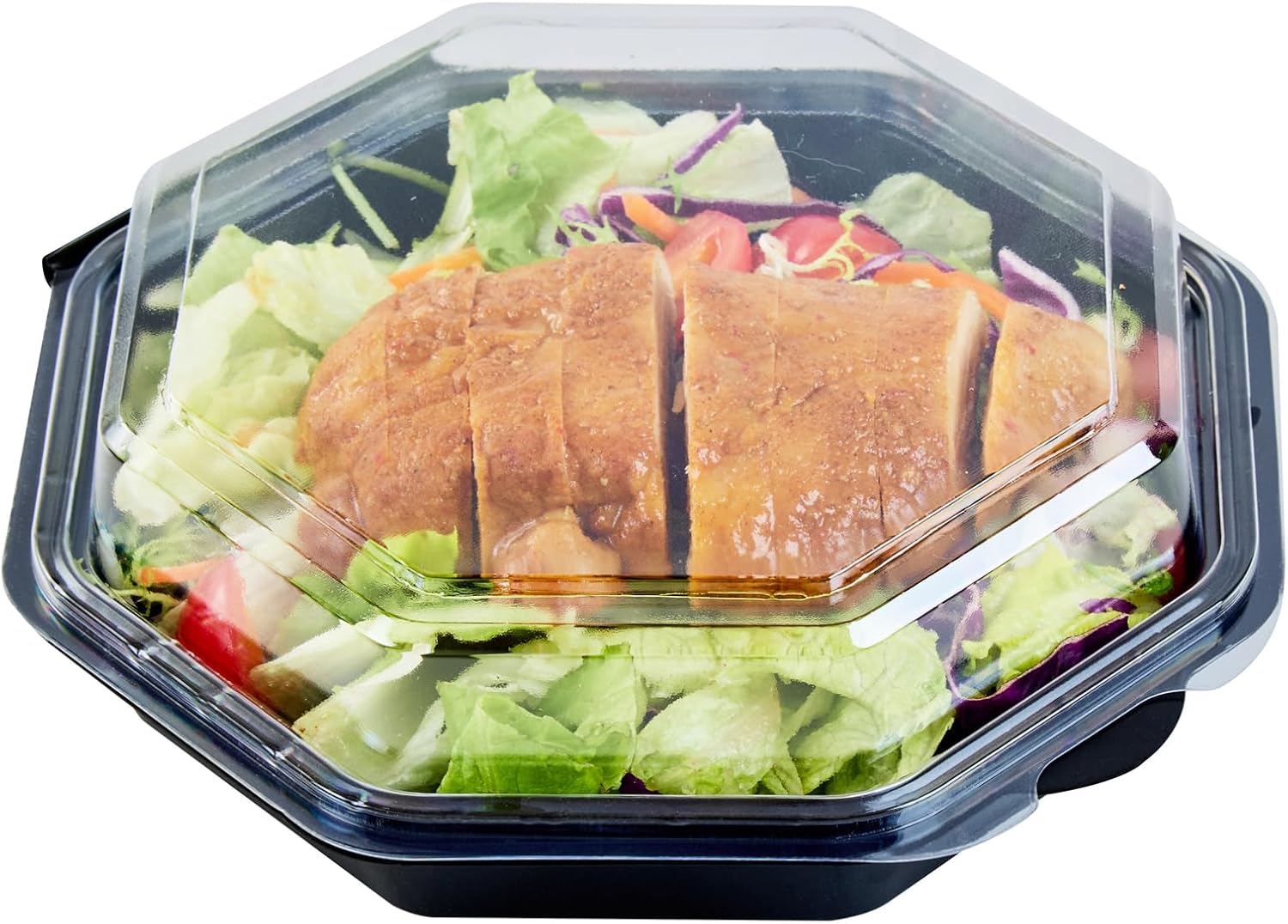 Ensure your meals stay fresh with grease-resistant and leak-resistant packaging. Chef 101 Leak-Resistant Plastic Takeout Containers are designed to keep food crisp and flavorful, making them the perfect plastic takeout containers for catering and delivery services. Constructed from durable PET plastic, these black food containers withstand the demands of fast-paced foodservice environments, providing reliable performance with a sleek appearance. The innovative clear lid showcases salads, desserts, and deli items, enhancing visual appeal and boosting customer sales. With a freezer-safe design, these containers are ideal for meal prep services. Cold food friendly, they maintain the freshness of salads and desserts, ensuring delightful customer experiences. Elevate your food presentation with the modern octagon shape, setting your offerings apart from competitors. Each order includes 100 Chef 101 Leak-Resistant Plastic Takeout Containers.