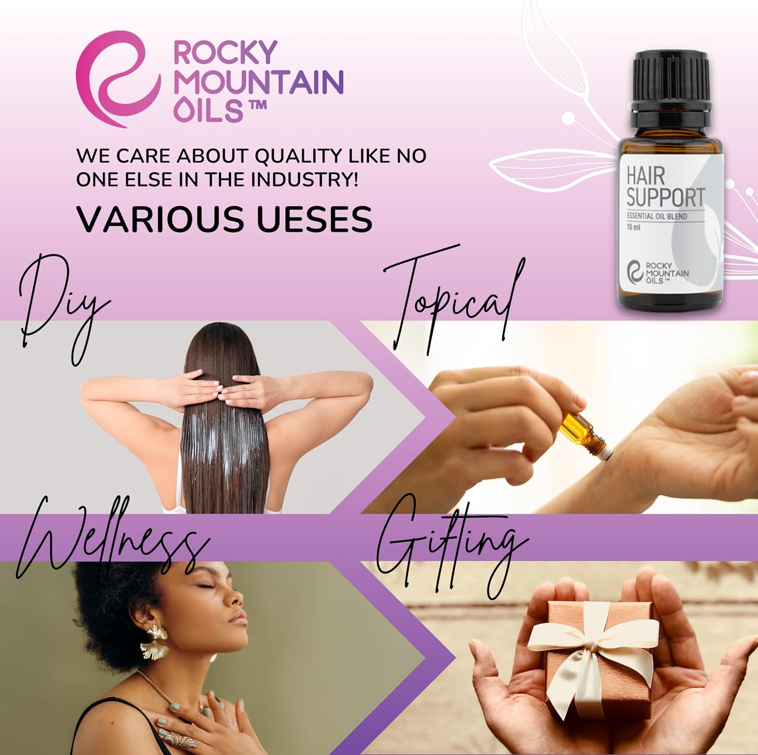 Rocky Mountain Oils Hair Support Essential Oil Blend with 100% Pure and Natural Essential Oils - Aromatherapy Oils for Diffuser, Topical Use for Hair Growth, Home Cleaning Oils - 15ml