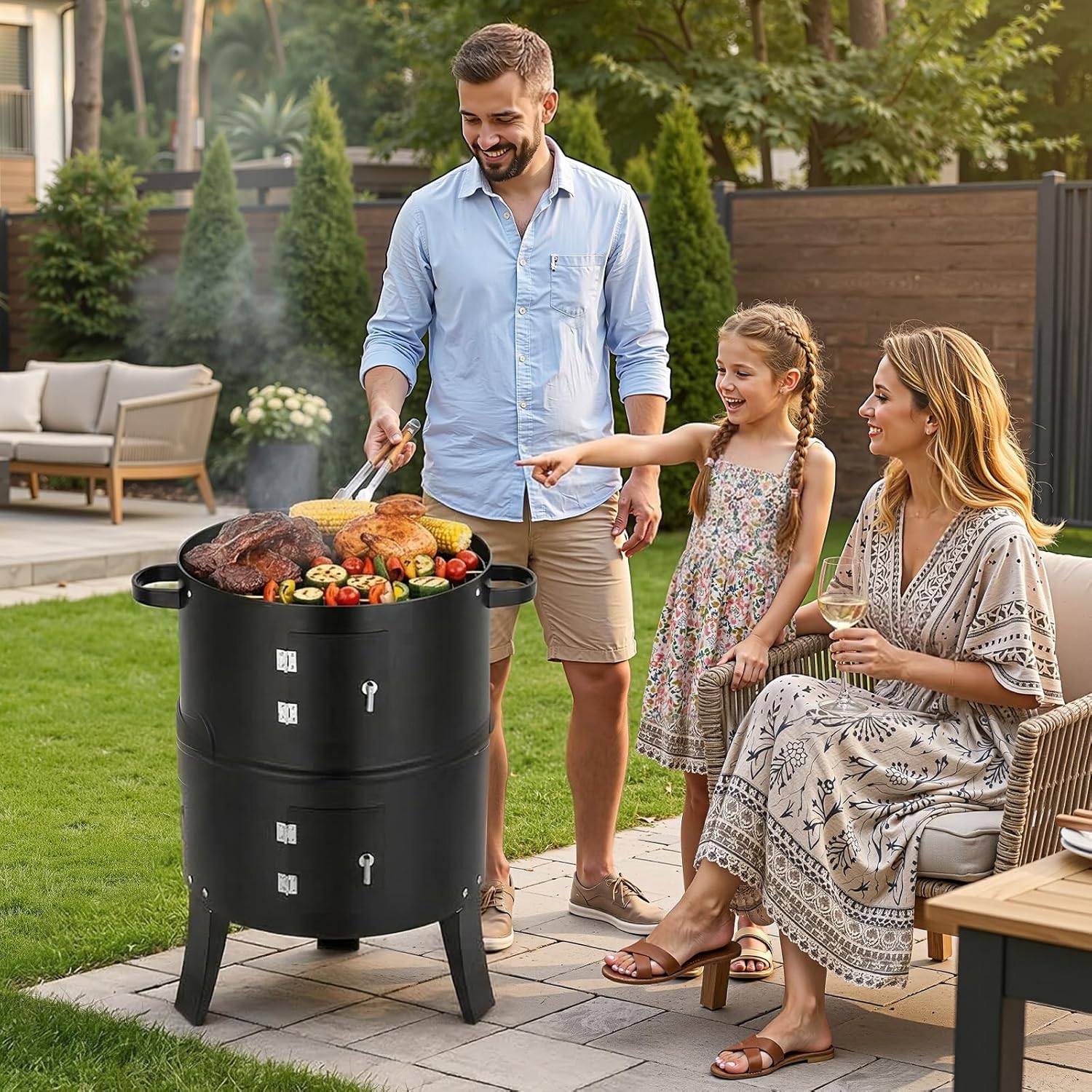 ROVSUN Upgraded 18 Inch Multi-Layer Charcoal Smoker Grill with Chimney – Heavy Duty Round Grill for Outdoor CookingElevate your backyard BBQ with the ROVSUN 18 Inch Vertical Smoker. This heavy-duty round grill features a multi-layer design, offering ample space for smoking meats, vegetables, and more. The built-in thermometer ensures precise temperature control, while the adjustable chimney allows for optimal airflow and smoke circulation. Perfect for outdoor cooking on the patio, parties, or family gatherings. Crafted from durable materials, this charcoal smoker grill delivers authentic smoked flavor every time. Ideal for BBQ lovers seeking versatility and performance in one compact unit.