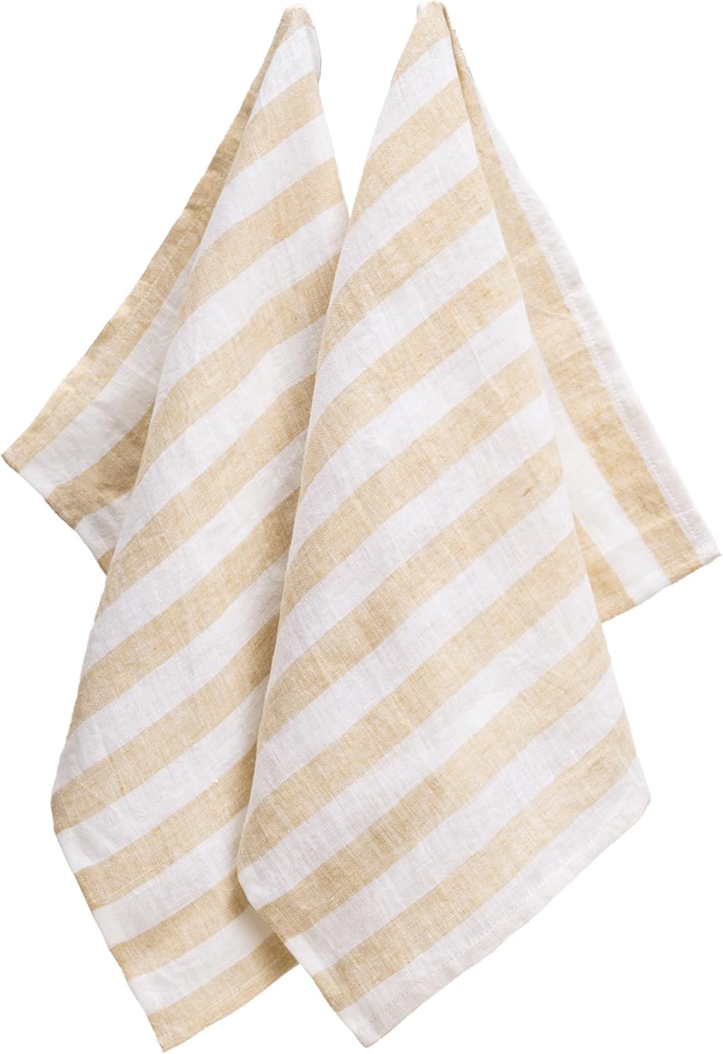 100% Linen Dish Towels: Each bistro kitchen towel measures 18 x 28" Set of 2 Mitered Corners. The striped dish towels are crafted with linen fabric, which makes them ideal for kitchen and household purposes. Linen kitchen towels are suitable for modern living and are bright and attractive.