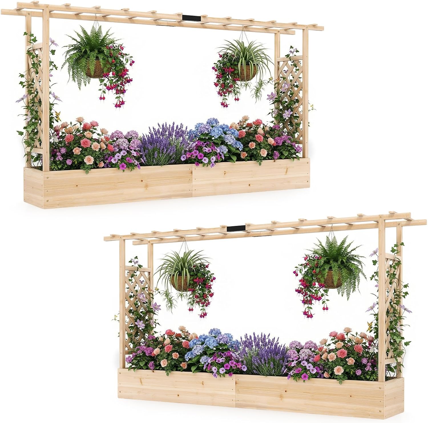 Create a greener and more inviting environment with this thoughtfully designed wood raised garden bed.This 2-in-1 garden planter combines a large planting box with a flat roof and side trellises, making it ideal for growing climbing plants, trailing vines, vegetables, herbs and flowers while also supporting hanging decorations. Crafted from solid fir wood, it is designed for exceptional durability and long-term reliability that complements both indoor and outdoor settings. An efficient drainage design helps prevent overwatering and encourages healthy plant growth, while refined craftsmanship ensures long-term use and visual harmony across patios, balconies, yards or entryways.Features:2 side trellises and large garden bed for climbing plants and flowersCrack-resistant fir wood for stable plant support and daily useSmooth and splinter-free surface for safe planting and handlingDrainage holes for preventing overwatering while encouraging healthier plant growthRemovable bottom panels for flexible planting depth optionsNatural wood appearance for indoor and outdoor placementExtended top design for enhanced visual balanceThickened boards for improved structural integrityTightly connected joints for overall stabilityFreestanding layout for easy placement in various spacesAssembly neededSpecifications:Color: Natural/OrangeMaterial: Fir WoodProduct Dimensions: 87” x 14” x 45”Interior Size of the Planter Box: 76” x 13” x 7”Weight Capacity: 110 lbsNet Weight: 22.5 lbsPackage Includes:1 x Wooden Raised Garden Bed1 x User’s ManualWhy You Choose Our Garden Bed?✔ Combine planting space and vertical display in one well-balanced garden solution✔ Crafted with solid wood and refined details for both function and visual appeal