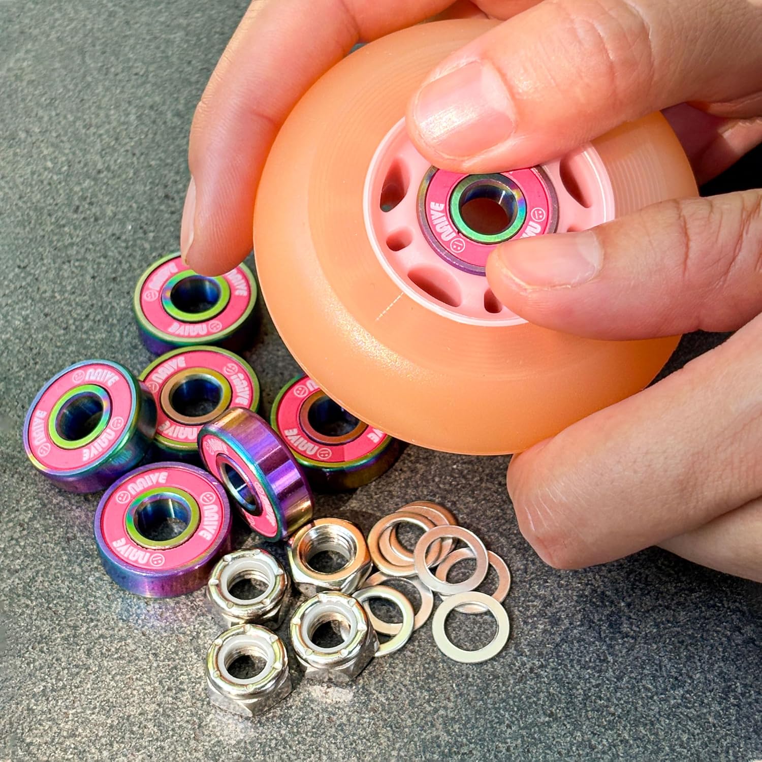 Naivskb Premium ABEC-9 Skateboard Bearings Set w/ Locknuts & Rings Kit, Bundle of 2 color of 2x8 Pack, Chrome Steel Balls and Color Coated Rings, Nylon Cage, Double Rubber Seals. Bearing size: 608-2RS, 8x22x7mm. Each pack comes with coated 5/16-24tpi lock nuts (x4), 8mm speed washers (x8).