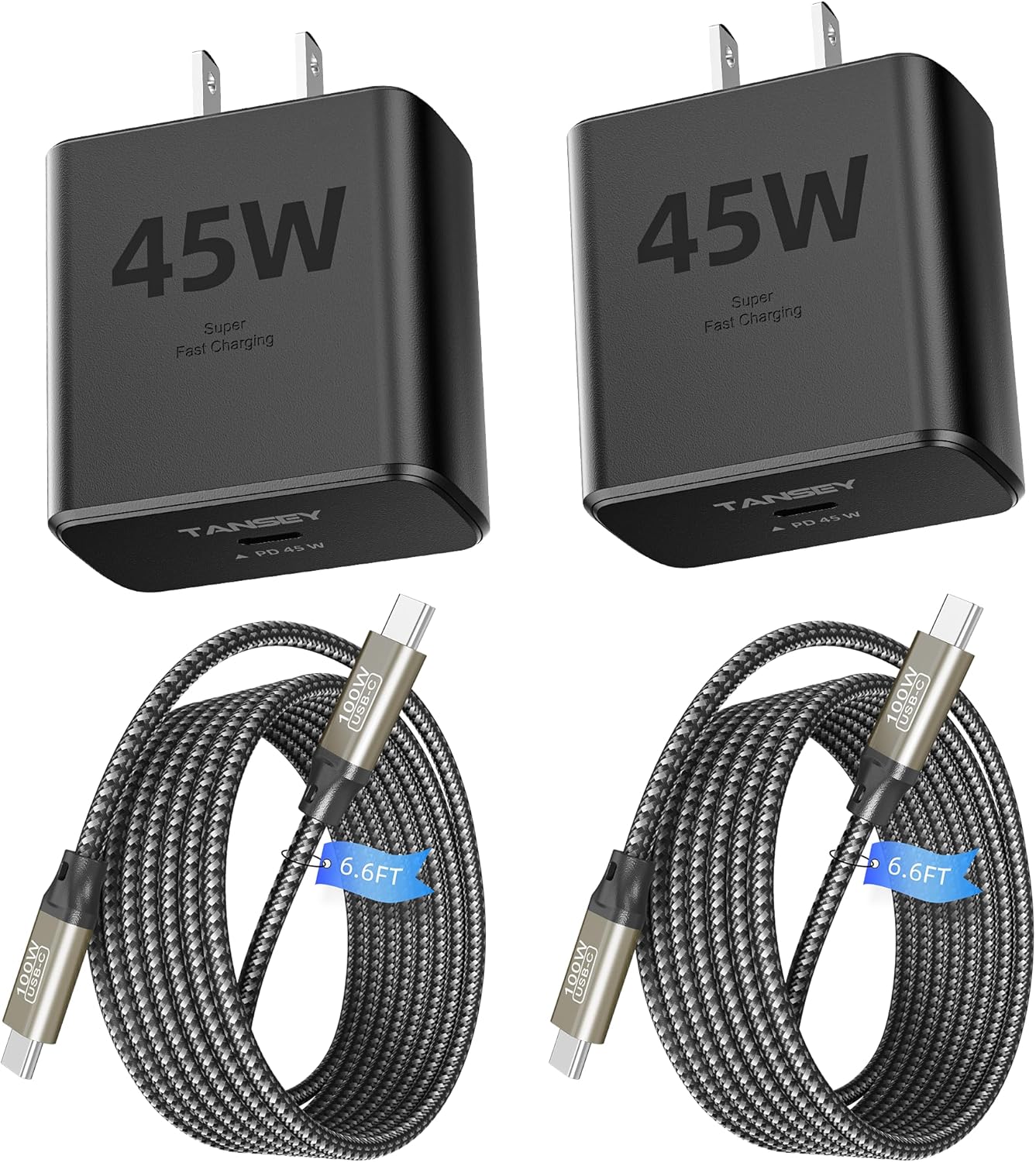• What You Get: TANSEY 45W Charger (2-Pack), 2 USB-C to USB-C cables, 2 cable organizers, an 18-month warranty, and friendly customer support.