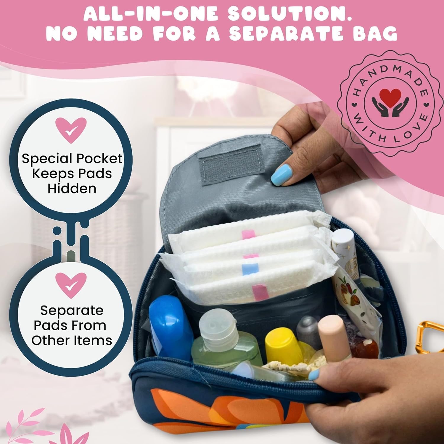 The Bloom First Period Kit is designed to provide young girls with everything they need to navigate their first period with confidence and ease. This 16-piece tween period starter kit is perfect for girls aged 9-14 and includes a stylish, discreet sanitary napkin storage bag for on-the-go convenience. Whether at school, during sports, or out with friends, this compact and lightweight pouch ensures they are always prepared, helping to relieve period anxiety and promote independence. Featuring unique compartments, the period kit bag keeps pads, liners, and other essentials neatly stored and easily accessible. Its waterproof exterior protects against spills, while a detachable wrist strap and clip make it easy to attach to a backpack or purse. Beyond being a practical storage solution, this kit empowers girls through education with a 100+ page eBook that provides age-appropriate, engaging content on puberty, periods, and personal care, helping them feel knowledgeable and self-assured. Designed for durability and convenience, the compact pouch fits easily into any bag while offering ample space for essentials, ensuring peace of mind no matter where she goes. Thoughtfully curated to make periods a stress-free and empowering experience, The Bloom First Period Kit offers both parents and girls reassurance, confidence, and readiness for lifeโs little surprises.