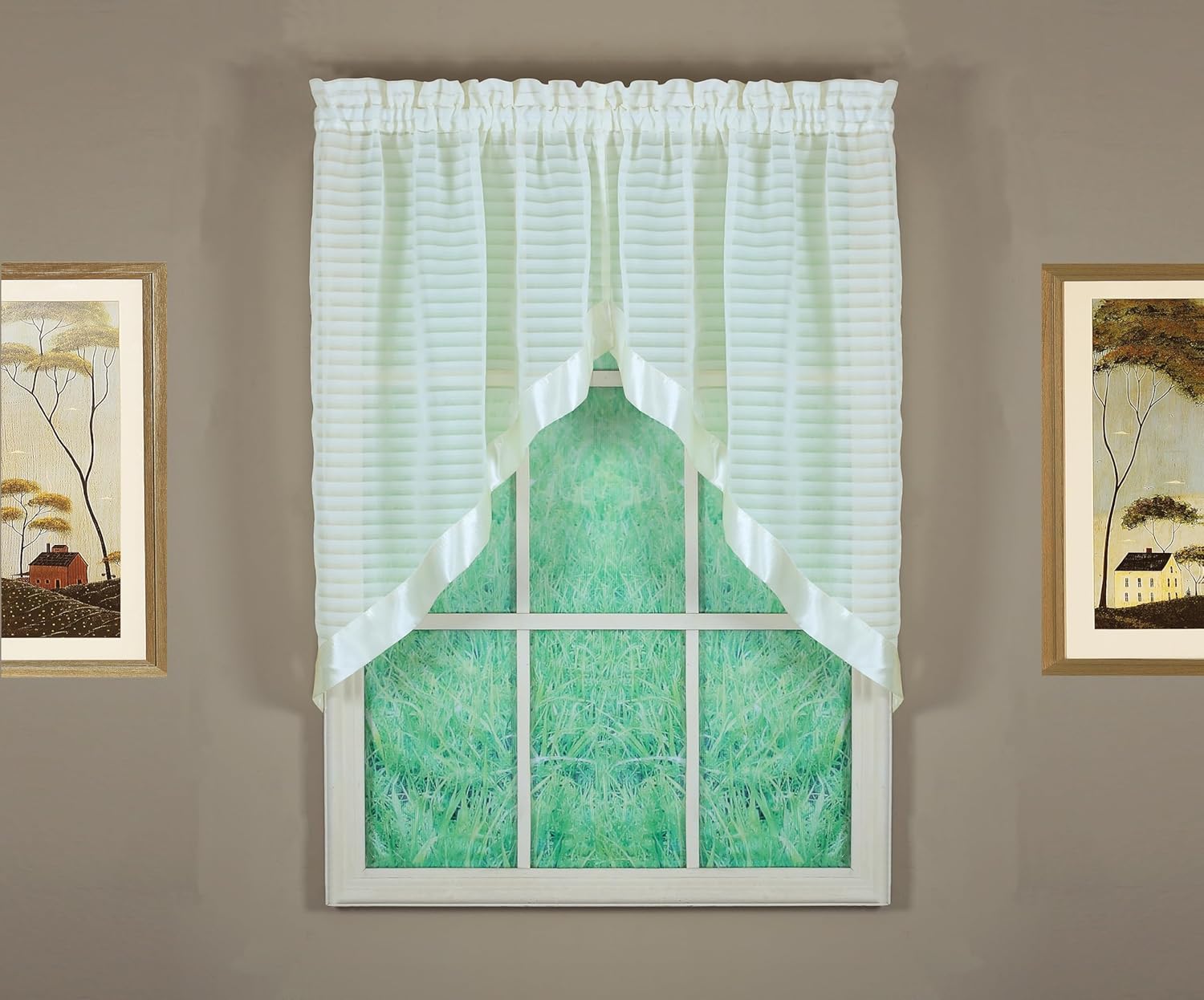 Two-tone woven stripe sheer, embellished with antique satin, Silhouette Sheer Curtain Collection features multiple unique styles of your window décor, easily and simply for any window of your house, as well as your bathroom. Enjoy the beauty of sheer curtains, the perfect light filter. Easy care, machine washable.