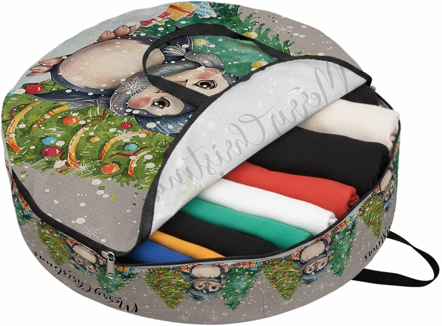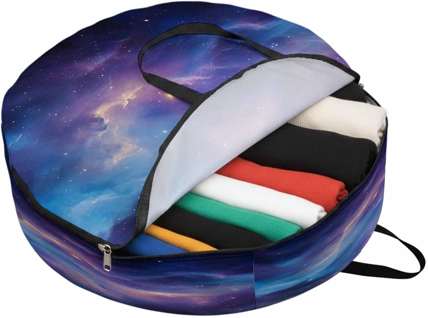 Reclaim Your Closet Space with the Round Storage Solution! Material: polyester Diameters: 24 inch, 30 inch, 36 inch Depth: 7 inches Package Includes: Round Storage Bag One Bag, Endless Possibilities: Whether you are swapping out your summer wardrobe, moving into a new dorm, or packing away holiday decorations, this bag has you covered. The circular design is uniquely suited for: Bedding: Comforters, quilts, sheet sets, and oversized pillows. Clothing: Winter coats, sweaters, and bulky ski gear. Home Decor: Holiday wreaths, garlands, and floral arrangements. Outdoor Gear: Camping blankets, sleeping bags, and beach towels. Dual Zippers: The high quality double zipper design allows the closet organizer to open wide from both sides, making it effortless to load and unload even the bulkiest comforters or wreaths. Reinforced Handles: Sturdy, reinforced handles are securely stitched to provide extra strength and a comfortable grip when carrying heavy loads or pulling the bag from under a bed. Clear Label Pocket: A transparent built-in label holder allows you to quickly identify the contents of each bag without ever having to unzip it, keeping your storage perfectly organized.