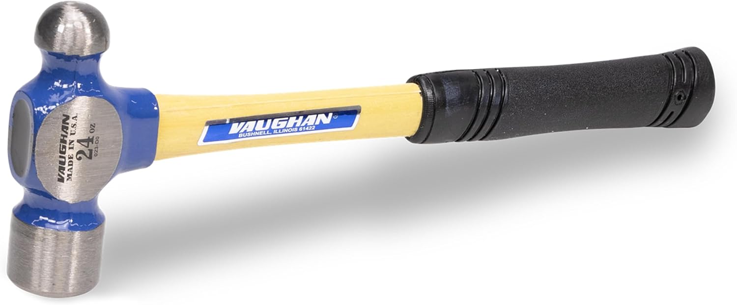 The VAUGHAN Hickory Handle Ball Pein Hammers strike and shape material in everyday applications. They are constructed of drop forged, heat treated American high carbon steel. These hammers have a ground, polished striking head and pein and a generous bevel on the striking face. Other surfaces have a rust-resistant powder-coated finish. Each hammer comes equipped with a compression wedged hickory handle. Made in the USA with Global Materials.