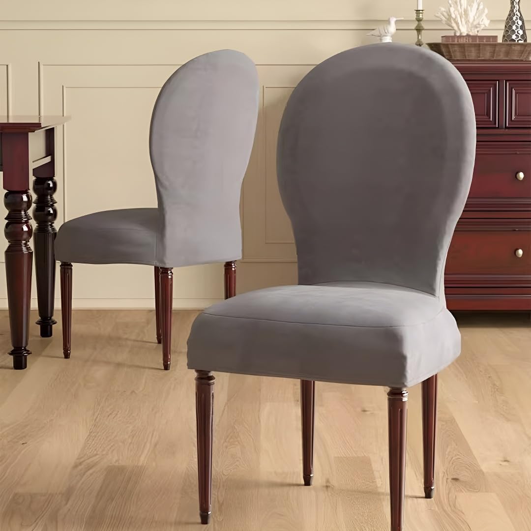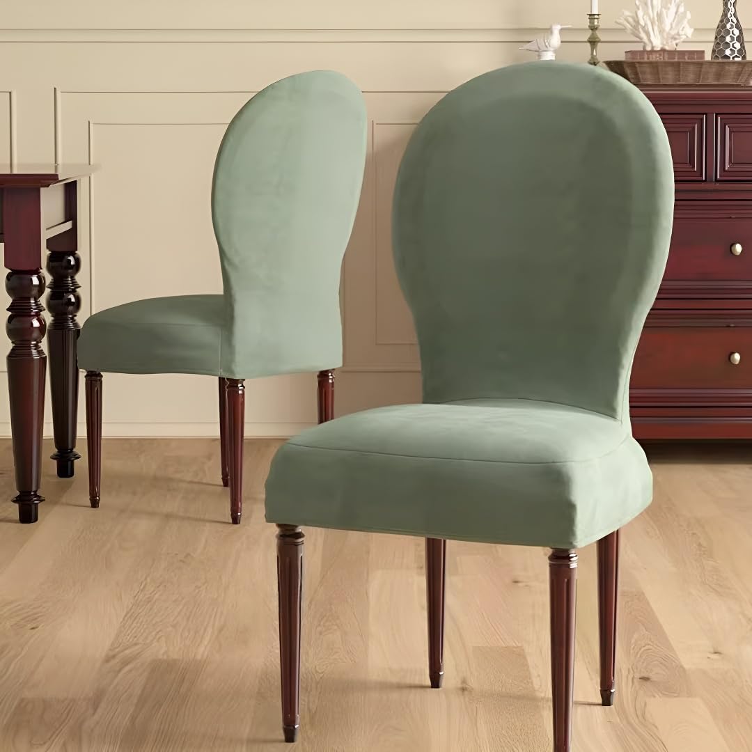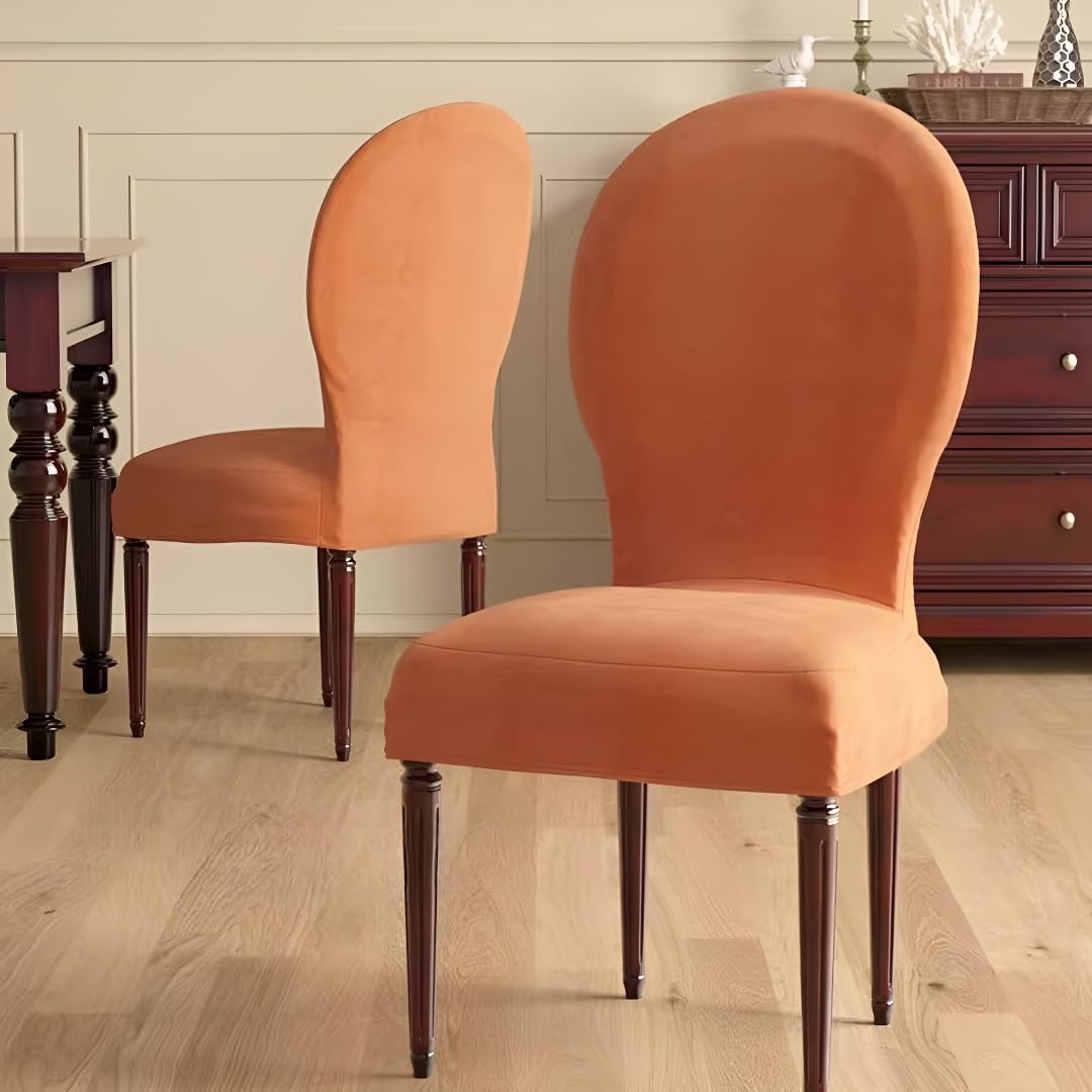 Product description Dining room chair covers made by soft polyester-spandex yard fabric. All-around elastic provides a clean, sleek look that goes on easily and stays in place. Suitable for all seasons. Fits most armless U.S style banquet, parsons and dining chairs, upholstered or non-upholstered. Freshen up your chairs, keep them clean and protect your furniture from dust, spills, stains, wear, fading and tear, prolong durability. These dining chair covers can be used for kitchen, bedroom, living room decoration, restaurant, cafe, studio, office or hotel, meeting, party, Christmas, wedding banquet, celebration, ceremony, etc. Easy to cleaning and wash, machine washable. Measure Guide To make sure getting the perfect fitting, please measure your dining chairs before ordering SIZE: 1. Sitting width:18.1-20in(46-51cm) 2. Sitting depth:15.8-17.7in(40-45cm) 3. back width:15.8-17.7in(40-45cm) 4. back height: 19.6-21.6in(50-55cm) package:2PCS/4PCS Round Back Dining Chair Covers(Excluding chairs)