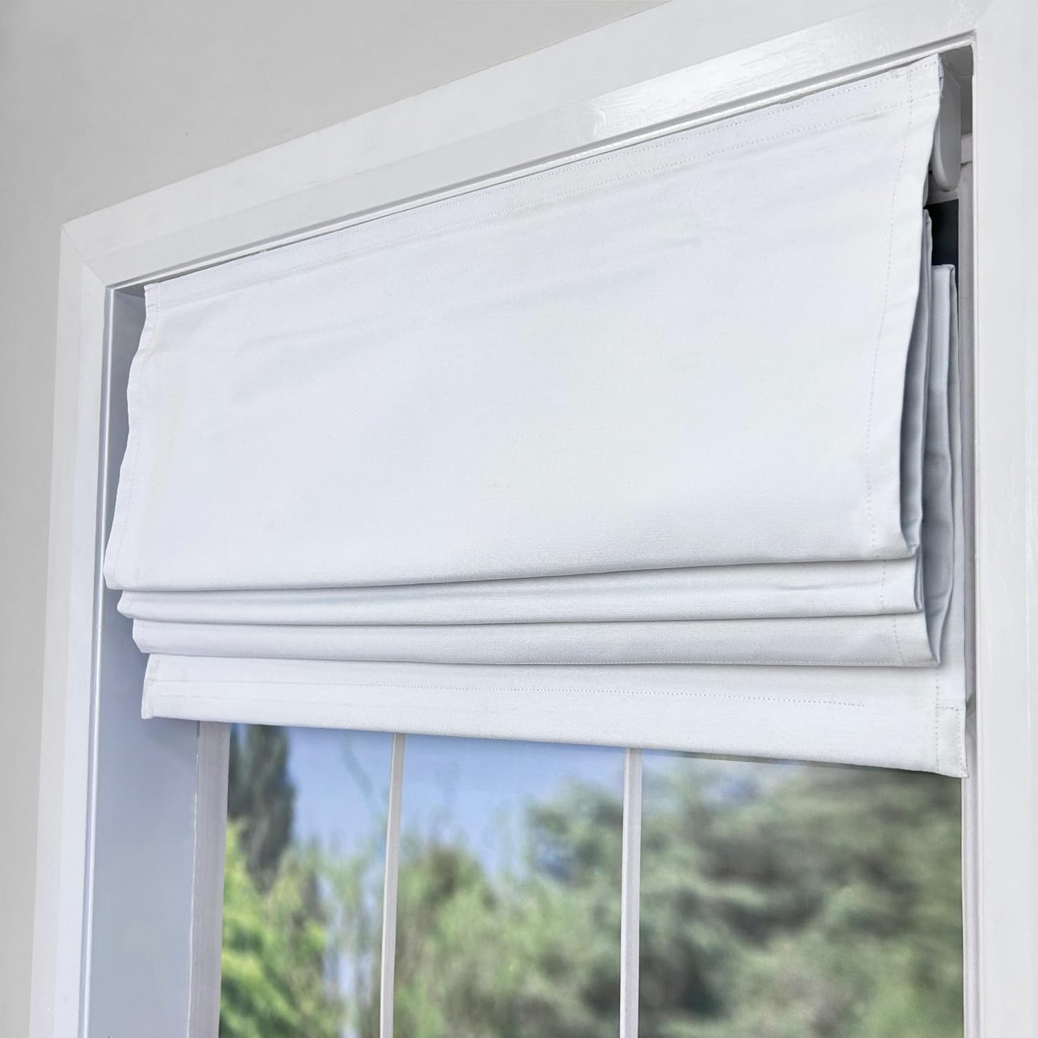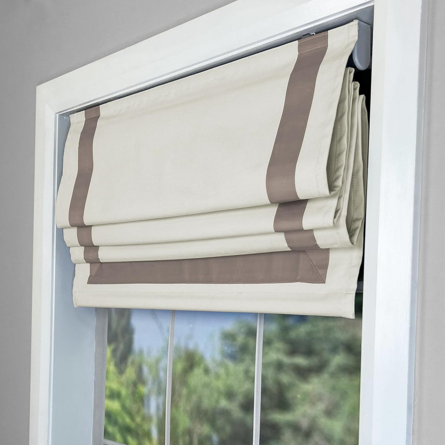 With its contrasting details, our Valentina Ribboned Cordless Roman Shade has a streamlined, versatile style while the blackout lining fully blocks sunlight. When lowered, our Roman shade fabric lays flat; as you raise the shade, an innovative roller mechanism pulls the shade up in one soft close motion without any cords. This collection is ideal for living rooms, bedrooms and dining rooms. Four-way mounting hardware is included: inside or outside mount of the window frame, and wall or ceiling mount brackets. Pair it with matching curtains or cushion shells from our Ready-Set-Go collection to create a seamless look throughout your home.