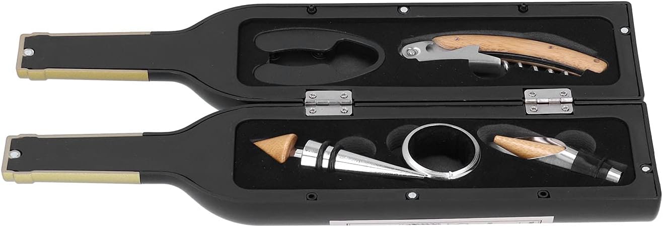 Item Type: Wine Corkscrew SetMaterial: ABS+Stainless SteelColor: Black+GoldWeight: Approx. 418g / 14.7ozStorage Box Size: Approx. 32.5x7cm / 12.8x2.8inApplication: Wine bottle tool, decoration, art collection, appreciation, gift and event celebration, etc.Package List:1 x Storage Box1 x Corkscrew1 x Wine Pourer1 x Wine Ring1 x Foil Cutter1 x Wine StopperNote:1. Please allow 0‑1 inch error due to manual measurement. Thanks for your understanding.2. Monitors are not calibrated same, item color displayed in photos may be showing slightly different from the real object. Please take the real one as standard.