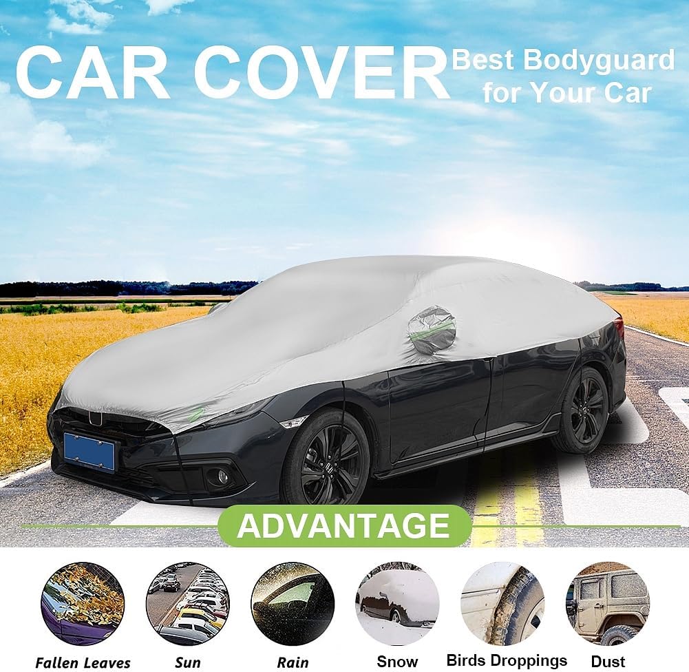 All weather protection, whether it's scorching sun, strong winds, or cold weather, the car cover can handle it all day long. It also protect your car from the hot summer sun, leaves, dirt, dust, scratches, snow, rain, industrial pollutants, and bird droppings.Product Specifications:1. Material: 210T Polyester Taffeta 2. Color: Silver 3. Size: 525cm/206.6"(Length); 245cm/96.4"(Width) 4. Vehicle Service Type: Sedan Packing Includes:1 x Half Car Cover