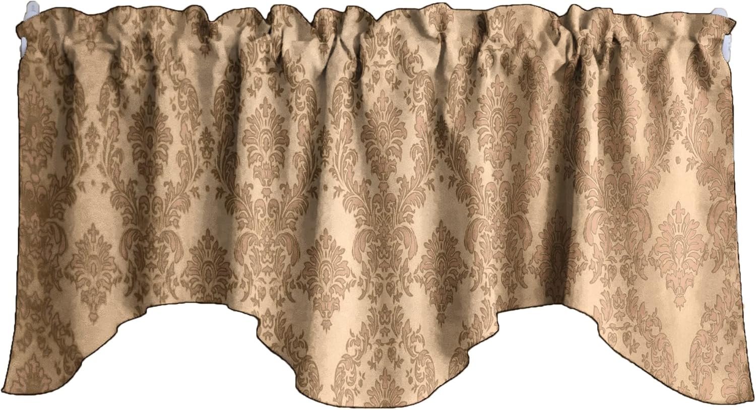 Flocked damask scalloped valance. This includes a valance with the measurements of 58" wide and 20" tall. One inch header above a three inch rod pocket at the top of the valance. Multiple colors available. The colors of products when viewed on your computer monitor may appear different than the actual color of the merchandise. We make every attempt to give you a good representation of the available colors for each product sold, but unfortunately we cannot guarantee an exact match. Easy care machine washable. Made in America.