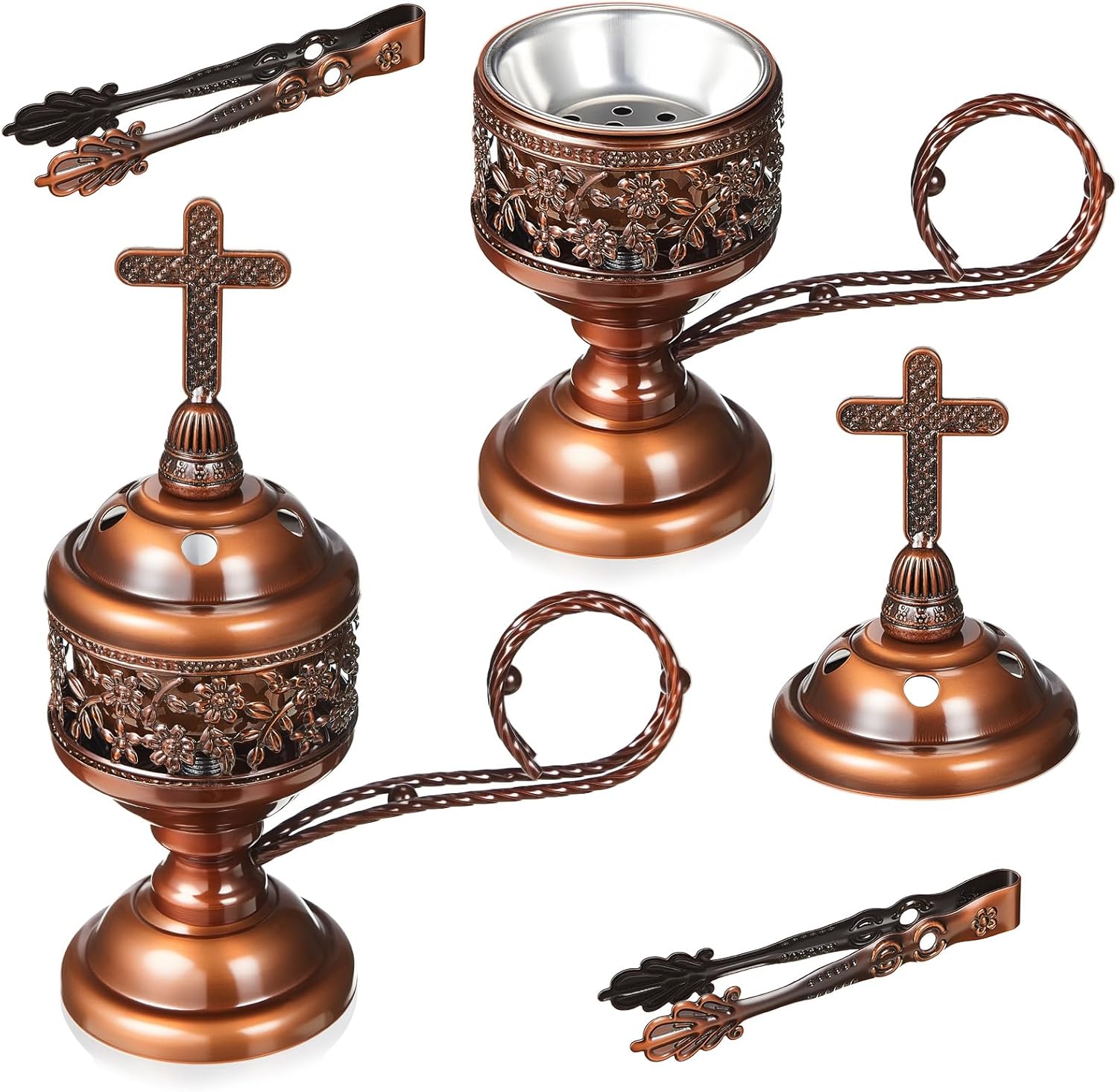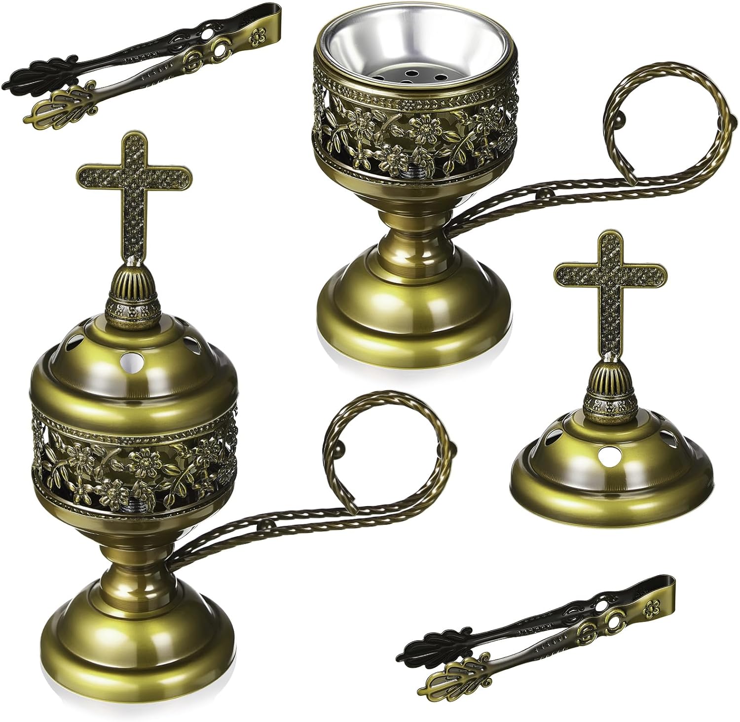 Features: Christian Gifts: It is the first choice of gifts for Christians, giving this beautiful golden censer to precious people, preserving good memories and friendships Elegant arrangement The beautiful shape can make it naturally integrate into the warm family atmosphere or yoga studio and church, bringing fragrance and elegant visual experience Specifications: Material: metal Color: gold Size: 15.5 cm/6.1 inches Package includes: 2 x Incense Burners 2 x Tongs Notes: Manual measurement, please allow slight errors on size. The color may exist a slight difference due to different screen displays.